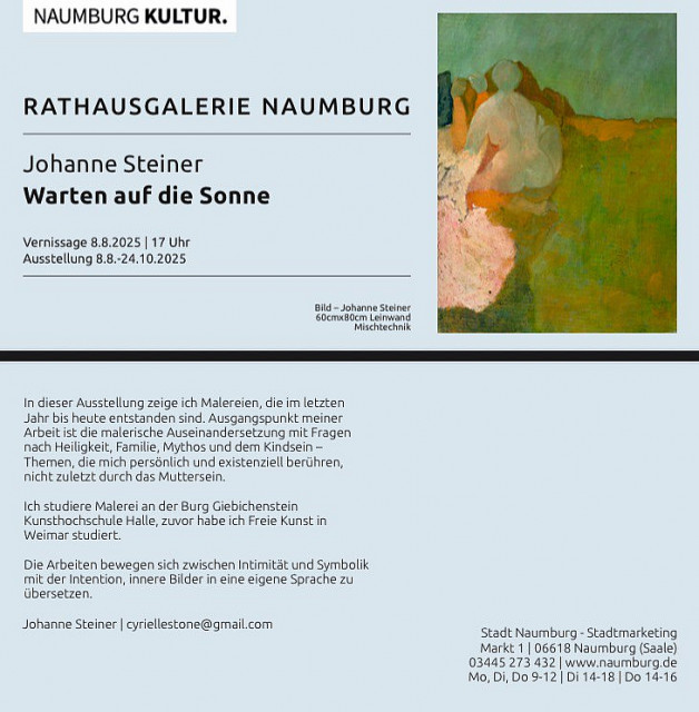 Ab dem 8. August 2025 präsentiert die Künstlerin Johanne Steiner ihre Ausstellung „Warten auf die Sonne“ in der Naumburger Rathausgalerie (Rathaus, Markt 1). Die Ausstellungseröffnung findet um 17.00 Uhr statt und wird musikalisch begleitet von Sängerin Yuliia Rabiuk und Pianist Tilman Heller.